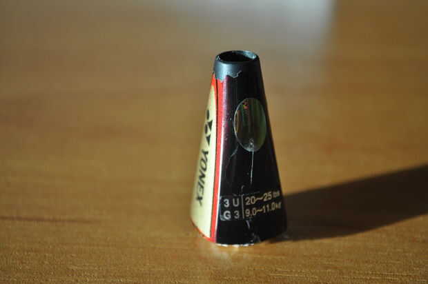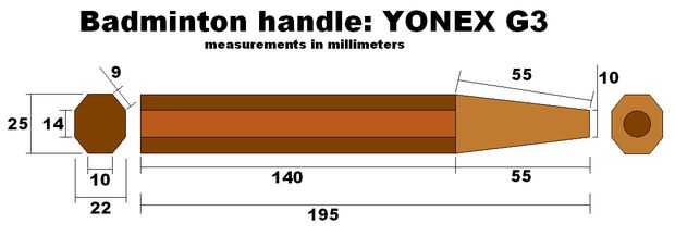 La cubierta delantera justo por encima de la manija tiene una pegatina con el tamaño del eje en él. Mina dice que es un tamaño Yonex G3 de la manija, así que ir a por el tamaño de la manija de G4. De hecho Yonex utiliza otros tamaños que otros fabricantes de raqueta pero mi tienda de bádminton le informa acerca de esto. Si quieres un mango más grande o más pequeño, este es el momento, elija su favorito.