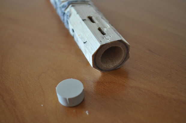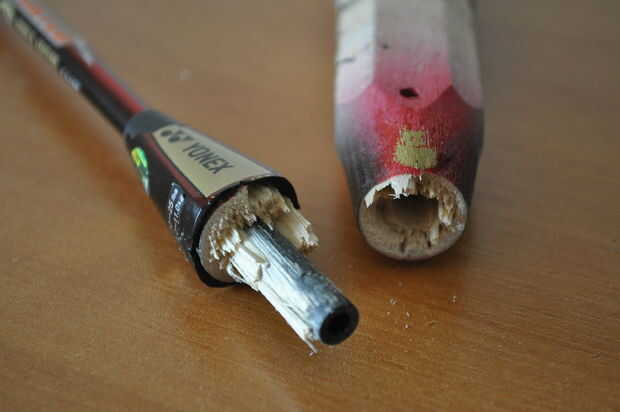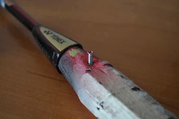 Recuperé también el casquillo de extremo plástico. El que viene con el nuevo tirador es simplemente negro mientras que el original es verde con el logotipo de Yonex. Una vez más depende de que usted elija. Sólo tienes que quitar 4 clavos en forma de U con un pequeño destornillador (la madera es muy suave por lo que es muy fácil). Debajo de esta tapa, hay otra tapa de plástico en el agujero que hace el mango menos pesados. También podría recuperar esto si tu raqueta tiene esto (sólo uno de mis dos raquetas tenía esto), no es crítica. Sale muy sencillo, cola no involucrados. A dividir la madera con un martillo y un cincel o un destornillador (Recuerde que la madera suave, muy fácil).