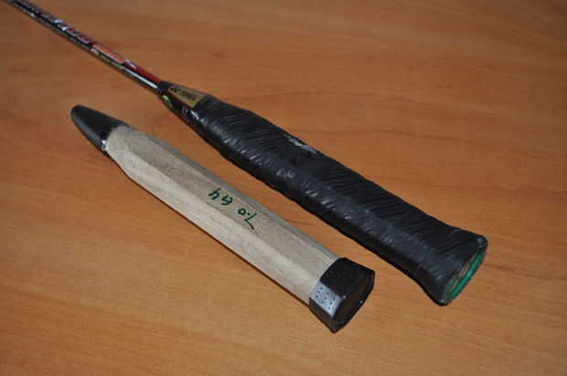 En primer lugar tienes que remover el mango. Sólo tire flojo. Puede tirarla y utilizar un nuevo uno (Compro uno en su tienda local de bádminton) o podría reutilizarlo en su nuevo tirador en combinación con el overgrip favorito (como hice yo). Depende de usted.