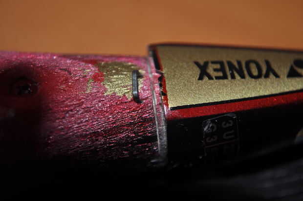 En este punto también descubrí por qué rompen mis manijas. Me atrevo a decir que es un mala producción paso/error. Después de aplica el apretón, el exceso se corta de justo debajo de la tapa frontal, esto se hace muy profunda e izquierdo un corte en la madera. La fuerza de la raqueta mientras jugando hizo este crack vaya más profundo dando como resultado una aflojamiento de la manija y en última instancia en un mango roto.
