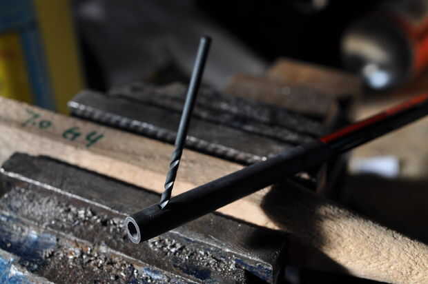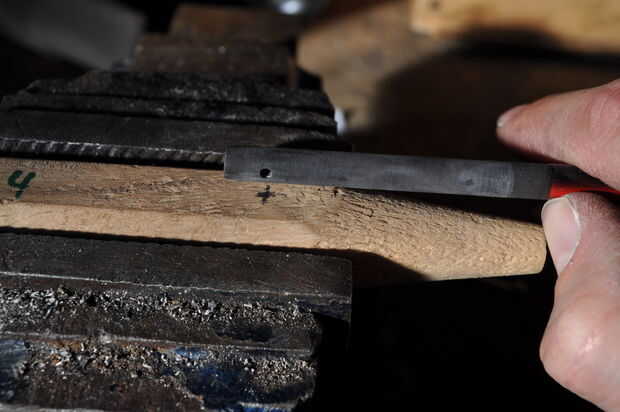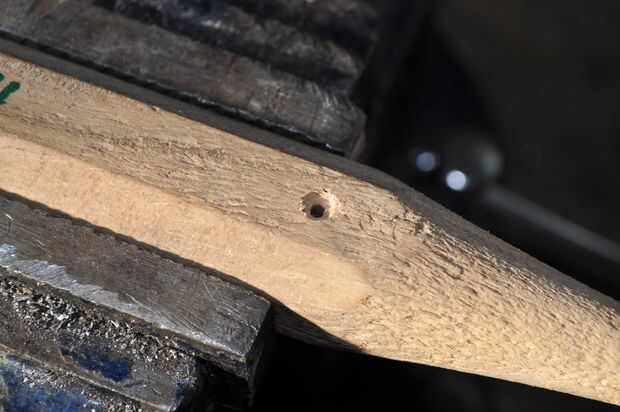Utilice una broca de 2 mm y una máquina de perforación. Cuidadosamente, perfore el orificio hasta que sienta que usted alcanzó el centro de la manija (el espacio donde encaja el eje). Asegúrese de que este agujero está alineado correcto insertando el eje, usan un clavo para verificar esto. Si esto no es bueno, tienen una segunda (y última) oportunidad en el otro lado de la manija. Si está bien, utilizar un taladro de 4 mm y sólo unos pocos milímetros del taladro en la madera para que la cabeza del tornillo se avellanado en el mango.