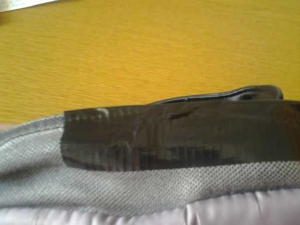 A continuación, aplique la cinta en ambos lados de la costura (aviso que en ese lugar, las dos piezas de tela son paralelas, con la extremidad libre del mismo lado. Corte la cinta por la mitad si es demasiado grande (era, en mi caso) y pegarlo para que cubra toda la parte que quieres coser y aún más hacia el cuerpo / de la cremallera de la mochila, pero no es redundante en el lado libre de la tela (en particular, donde se dobla la cinta debe adjuntar tanto como sea posible a la tela no se pega a sí mismo).