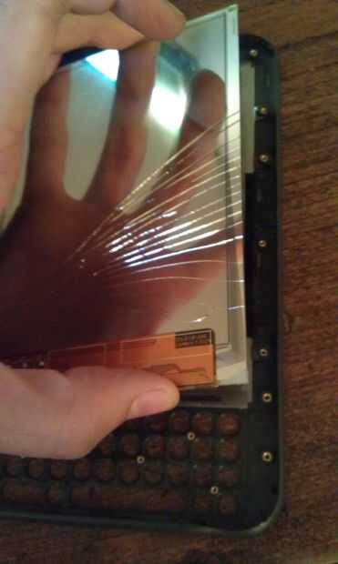 DEBE ser muy cuidadoso en este paso porque las pantallas de tinta electrónica son sorprendentemente delicadas. La parte posterior de la pantalla está hecha de una pieza muy muy delgada de vidrio y cualquier esfuerzo de torsión o torsión a crackearlo. Normalmente el caso de la Kindle evitará que este tipo de daño, pero cuando está hacia fuera como un pedazo separado es extremadamente vulnerable. Realmente la primera vez que hice este procedimiento, lo rompió!