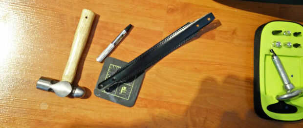Deberá perforar agujeros para los pernos. Ya tengo un punch de cuero pero estoy seguro de que podría trabajar un clavo en una pizca. Asegúrese de utilizar la estera de golpe bajo el cinturón. Afortunadamente no se necesita publicar un Instructable sobre reparar suelo laminado...