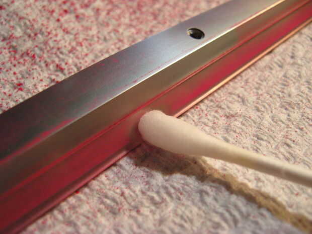 Con 91% de alcohol isopropílico en hisopos de algodón para limpiar los depósitos. Esto toma un poco de presión, algunas vigoroso y hacia atrás y un poco de paciencia para obtener los depósitos a la hoja. Puede una lupa para verificar dos veces que se ha limpiado todo el toner de la hoja. Es importante no rayar la hoja para no raspar con un destornillador o algo. También puede ayudar a mantener la hoja plana sobre la mesa, con el fin de evitar la flexión de la hoja.