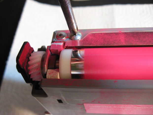 En primer lugar los 5 dentro de los tornillos de la placa deflectora. Tenga cuidado de no tocar o rayar el rodillo. Estos tornillos son cortos. Tienen la cuchilla en la parte inferior del carro. No ejerza demasiada presión para estos tornillos.