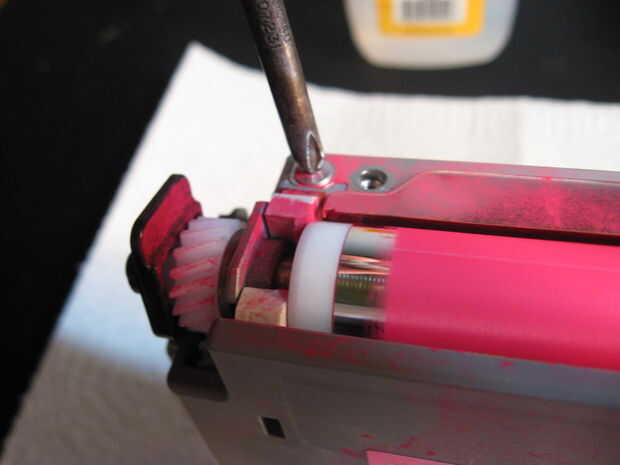Quitar los dos tornillos exteriores. Estos tornillos Sujete el carro a la carcasa del cartucho. Son aproximadamente una pulgada de largo.