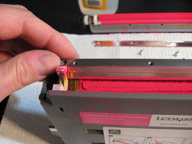 Bajo el carro es un par de palas de plástico que el tóner sobre el rodillo de alimentación y recogen tóner. El rodillo se torne hacia usted, por lo que el disco superior es el que hace que el toner se trata. Apropiación de las esquinas de las cuchillas, puede suavemente trabajarlo suelta de su alojamiento en el cartucho. Habrá mucho de tóner, así que trate de impedir que vuelan alrededor de demasiado.