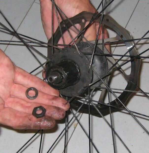 Aquí está el cuerpo de rueda libre y eje en su lugar. Extraiga la tuerca de atasco y la arandela en el eje primero retire la tuerca de cono del rodamiento. Esto mantiene los rodamientos en su sitio.