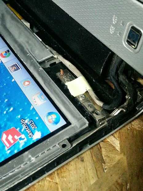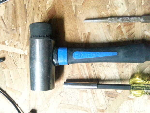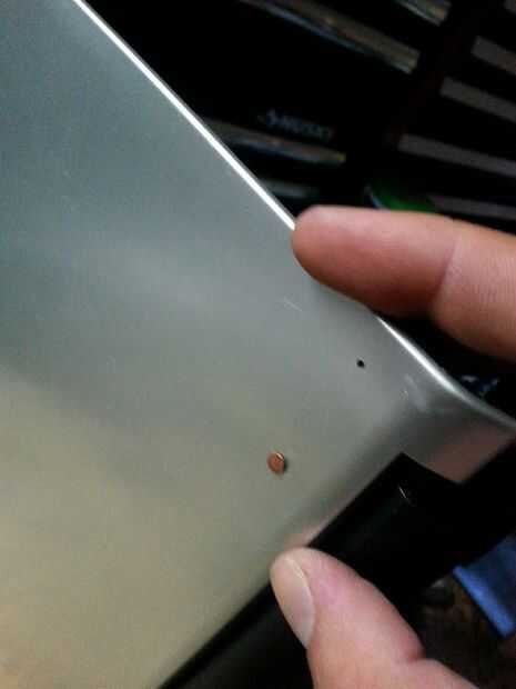 A continuación, inserte las tachuelas de la parte posterior de la pantalla a través de los agujeros que acaba de hacer. Es un ajuste apretado, use un tuercas o casquillo como un punzón hueco para conducir la bisagra hacia abajo en la virada.