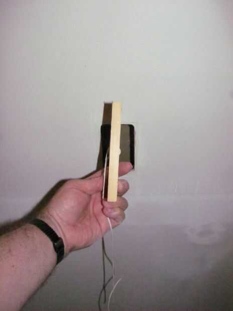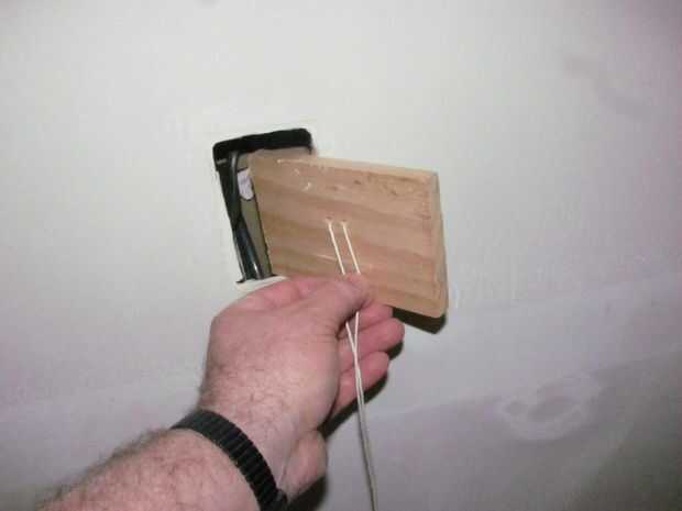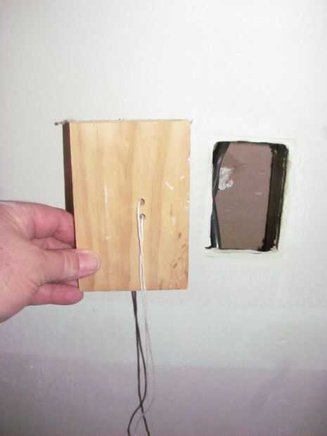 Antes del siguiente paso, limpiar los bordes del agujero en la pared por lo que no hay los bits de yeso papel sobresalga y prueba de ajustan la pieza de madera para asegurarse de que usted puede conseguir fácilmente la madera a través del agujero y tirado apretado contra la parte posterior de la plancha de yeso.