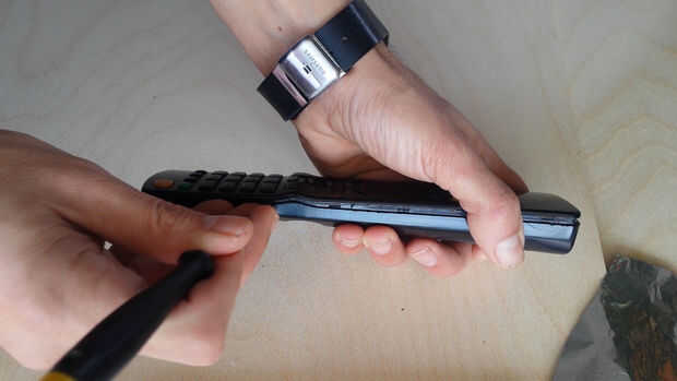 Desarmar el control remoto. Algunos de ellos tienen tornillos y algunos no. Mina no tenía ninguna así que usando un destornillador plano desmontar muy fácilmente.