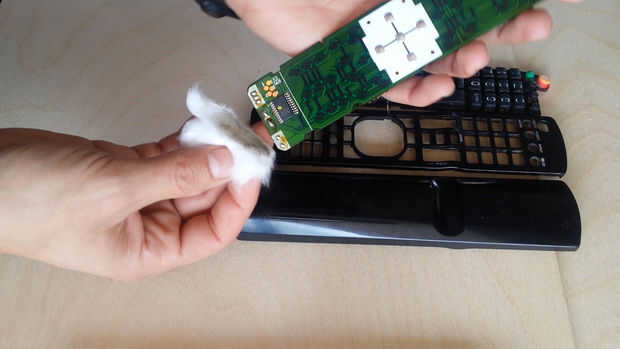 Ahora toma todas las piezas de su control remoto y darles un buen lavado con un jabón suave. Lave todos los plásticos y también el teclado numérico de caucho. No se debe lavar la placa principal!