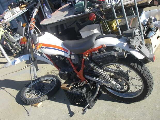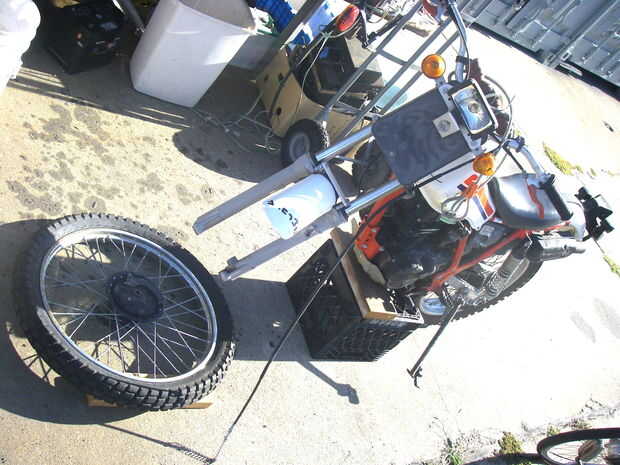 Una pata de cabra doble sostendría la moto muy bien con la rueda delantera, pero esta moto no tiene uno. Esta es mi moto de pruebas de Honda TLR200 1987. Fue despojado de racing, estoy en el proceso de poner señales legales calle improvisadas y luces en él. Por eso las luces en esta moto mira un poco raro. Esperamos ver pronto ese proyecto.