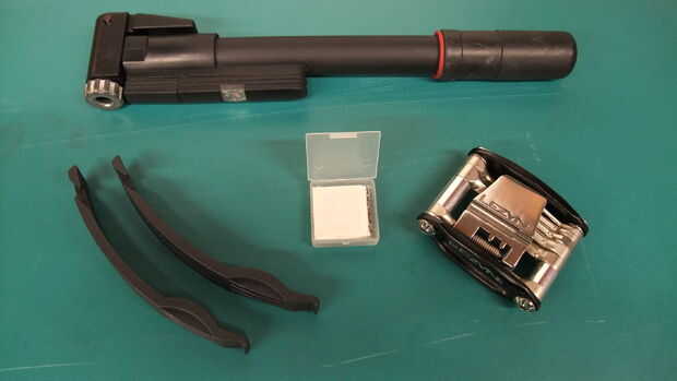 2. siempre lleve su kit de herramientas de fiel al ciclismo. Te recomiendo lo siguiente: 2 palancas de neumático plástico, innertube parches, una bomba de tamaño mini y una herramienta multiusos de la bicicleta. Tu tienda de bicicletas puede enganchar para arriba con todo este material y cabe fácilmente en cualquier mochila o bolso.
