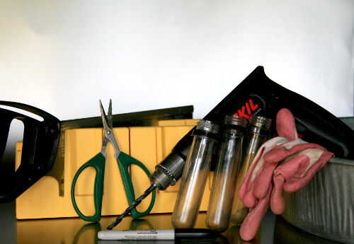 Viles que utilizan son realmente viles de levadura que usa mi marido para el colado de su hogar. Son rondas unblown soda (también conocido como botellas de refresco antes de ser soplado y formado) y están hechos de plástico. Si se utiliza vidrio, no necesita la caja de ingletes, la sierra y el marcador permanente. Corté los viles porque no eres tan bonitas como el vidrio. Aún así, tenemos un montón de ellos.