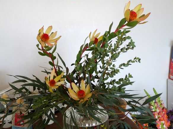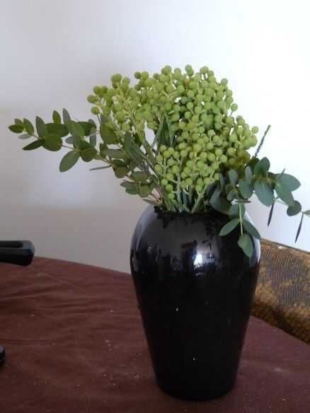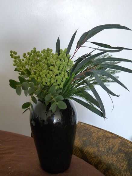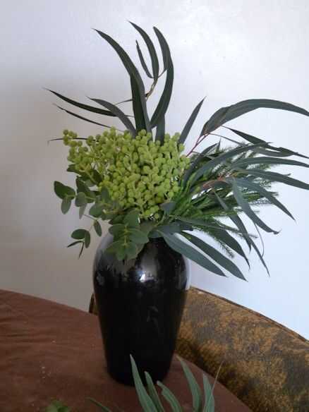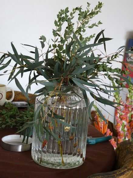 Tengo eucalipto de sauce y leucadendron y parvifolia variedades 'decoloración'. Mis flores y verdes se encuentran en el cubo por mis pies, pero usted también puede colocar plana junto a su vaso y funciona de esa manera. Implica menos flexión y como te lleva menos de una hora para crear tu arreglo, ninguna flor comienza a marchitarse (.. .unless es superior a 80 grados donde trabajas, excepciones a cada regla). También podría poner el cubo sobre la mesa a tu lado, pero podría impedir la vista de la disposición.