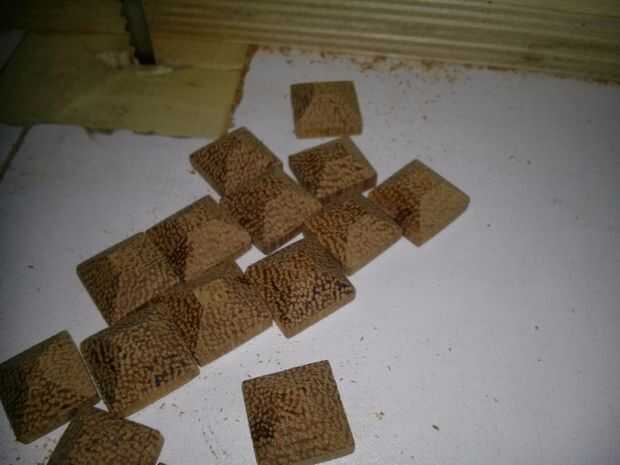 Se encontraron algunos restos scrapwood de un viejo windowframe de afzelia. Para ocultar los agujeros avellanados, decidimos cortar la madera en tiras largas, sólo el tamaño adecuado para cubrir los agujeros. En el discsander (pero se puede usar cualquier otro tipo de lijado) las tiras tienen arena en un ángulo de la pirámide. La cabeza acabada consiguió cortar después de cada lijado de nuevo. Repite mucho y tiene una cubierta para cada screwhole que hicimos. Doblamos los bordes agudos de handsanding.