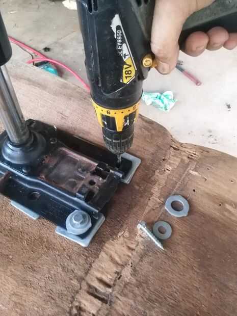 La base tiene 6 agujeros que sólo tenga 4 ya sólo necesita 4, para recibir 6 tirafondos con arandelas lo consigo todo estable en el Banco de trabajo de arriba hacia abajo, verifique mi longitud del tornillo y luego perfore un orificio piloto, control tornillo longitud insertar medio apretado, luego re posición si es necesario, siguiente tornillo largo , como embalado en un ángulo que usted necesita tornillos de diferente longitud corté el resto con cortador de perno. poner el resto de los tornillos (no taladre a través del Banco no quiere cosas aquí Revise la longitud del tornillo 3 veces mejor)!!!