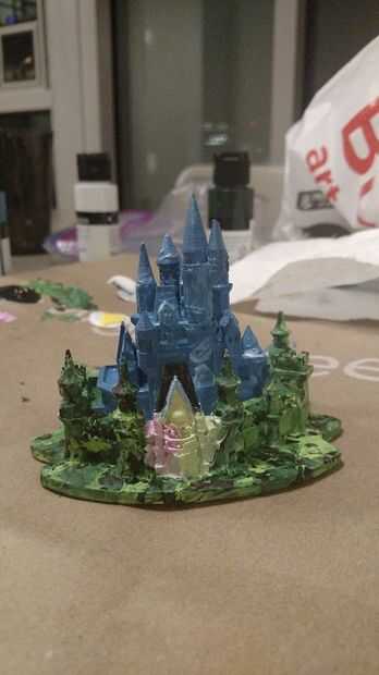 Para el cielo, me ha añadido un poco de blanco a la pintura azul y había cubierto al muchacho todo para el castillo que estaba siendo blanco. Una vez que seco, he añadido un poco más blanco para hacer unas nubes tenues, pero sobre todo consiguió cubierto por los globos en el paso siguiente.