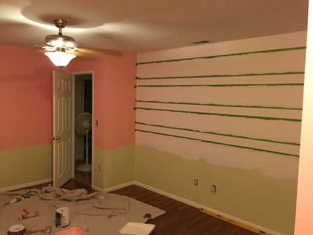En primer lugar, tenga cuidado de cualquier pintura que usted quiere hacer a la sala. De nuestro vivero, hemos decidido pintar la paredes rosa y blanco de una pared con rayas gris como una pared de acento. Pintando las paredes una vez que los paneles de revestimiento es posible, pero decidimos pintarlos primero para eliminar el riesgo de goteo de pintura en los paneles.