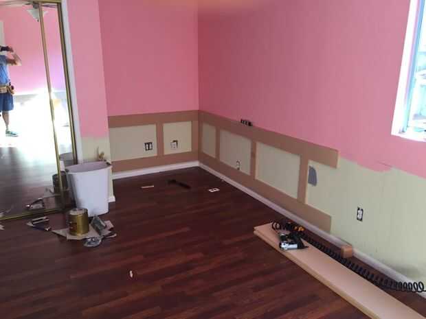 Usé una lata de galón de líquido clavos difunda muy liberalmente en la superficie de toda la pared lateral y calibre 16 broches para sujetar a la pared. Utilizar esa línea pones alrededor de la habitación para alinear el borde superior de los paneles. Si todo salió bien, ambas esquinas deben unirse perfectamente.