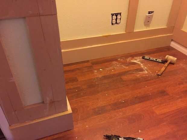 A continuación, utilice más tiras MDF de 5 1/2" y pones piezas a lo largo de la planta. Esto cubrirá hasta la brecha que existe entre el piso y el riel inferior.