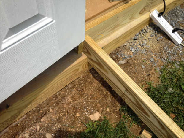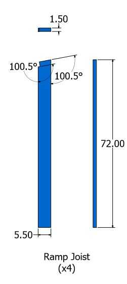 Usé 4 viguetas para la rampa espaciados a 22"(20,67" claro) aparte. Esto permite que 2" de proyección exterior para los listones de la cubierta. De mis anteriores cálculos, determinó que necesitaba un 10,5 grados (90 + 10.5 = 100,5 grados) para golpear el suelo con una rampa larga de 6 pies. Para cada viga, corté el ángulo y la medida de la distancia y corte la muesca descanse sobre el 6 x 6. Ya que tuve que hacer esto 4 veces, hice una plantilla de madera. Utilicé una sierra de mano para hacer este corte.