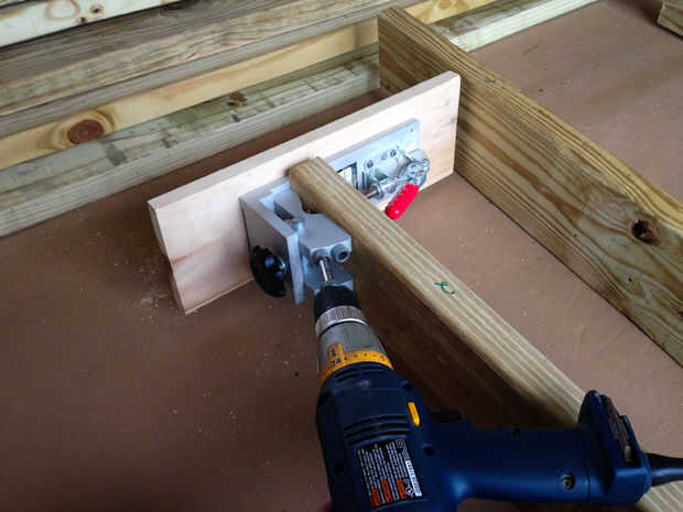 Usé una plantilla de pocket-hole para perforar agujeros a través de cada vigueta.