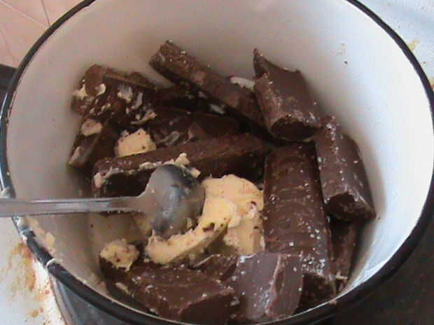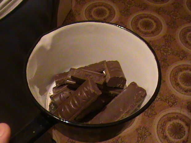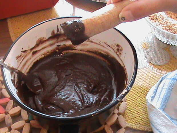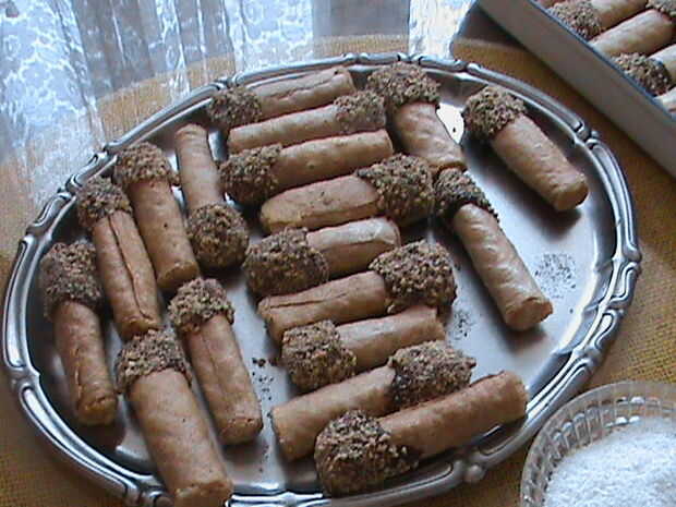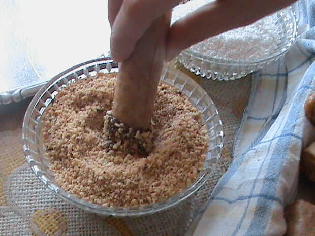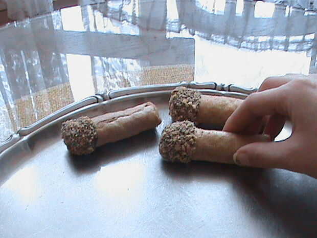 Cuando los rodillos estén secos, derretir el chocolate negro (Añadir pieza de mantequilla, 1 cucharada de leche y 1 cucharada de azúcar de vainilla en la olla), sumergir un extremo de un rollo de chocolate derretido y espolvorear con avellanas rosted de tierra.