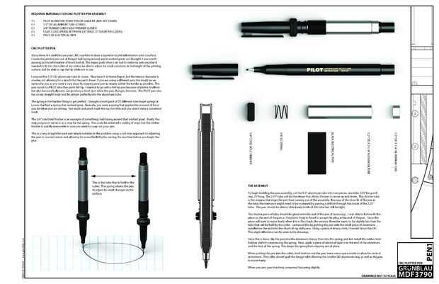 La pluma que utilizan es una piloto ultra punta fina punta de fieltro. Quería ir con un rotulador por tradición de plotter pero también porque el bolígrafo puede producir un punto muerto cuando la pluma cambia de dirección. La pluma de piloto también tiene un cuerpo muy recto y encaja casi perfectamente en el tubo de aluminio.