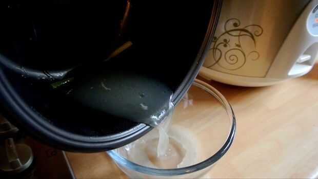 7. después de 25 minutos, quitar el pollo de la olla arrocera y vierta el caldo de pollo en un recipiente.