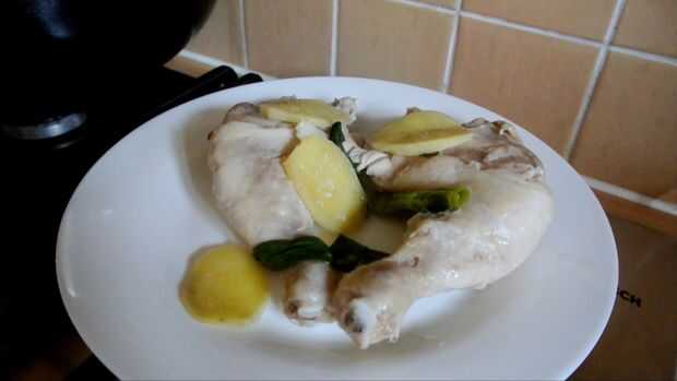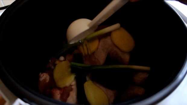 3. cambiar la olla arrocera al modo de 'Keep Warm' y poner en 2 piernas de pollo con la piel hacia abajo.