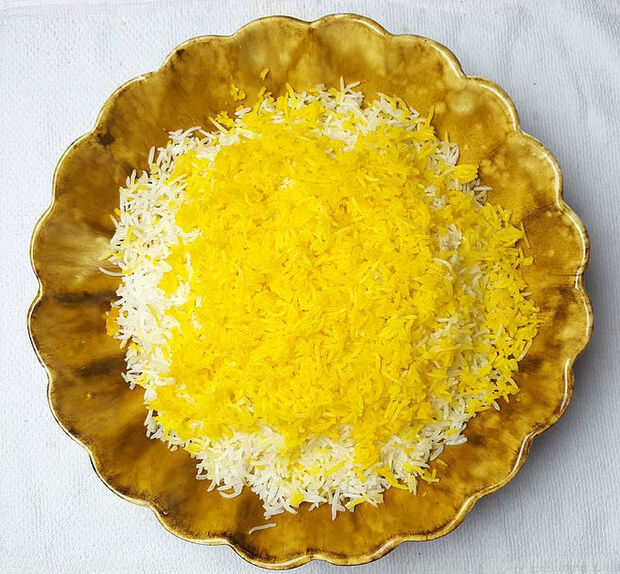 Este arroz es un alimento básico en mi casa. Puedo hacer que al menos uno por semana con algún tipo de proteína o khoresh. Este arroz se cuece con el método de chelow. Incluye preremojo, pre cocción y cocinar al vapor el arroz. Esto resulta en un arroz meloso con cada grano se separa, y el fondo de la olla tiene una corteza marrón dorada crujiente llamada tah-Cave. Esta receta también puede encontrarse en charlieforstar.com.
