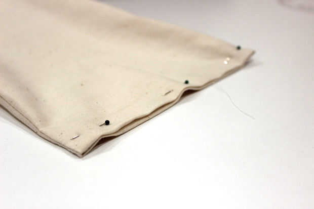Tomando el extremo abierto de la bolsa, doblar los bordes sobre 5/8" y los pines juntos. Hilvanar puntada alrededor de 1/4" desde el borde.