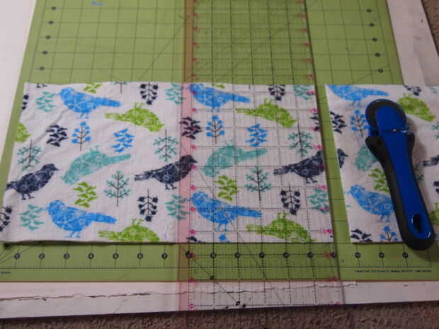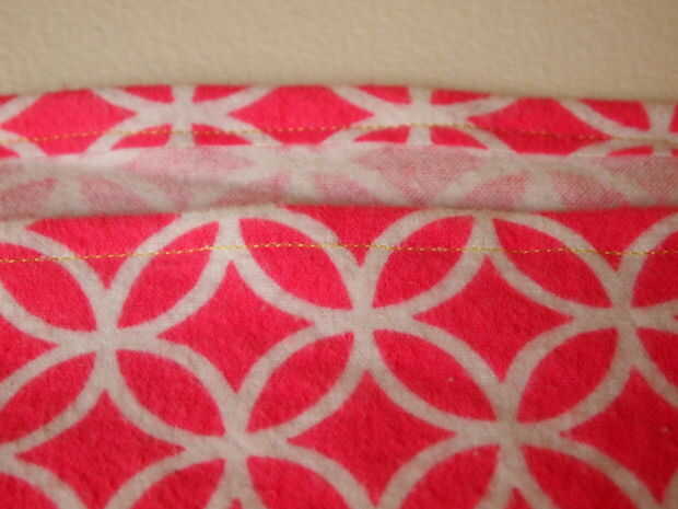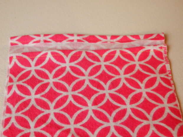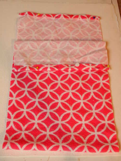 Una vez que has cortado éstos hacia fuera, ponen hacia fuera la manera larga (o como dicen los niños en la escuela - el hotdog forma) y tomar los bordes del material en ambos extremos y doblar en cerca de 1/2 una pulgada y pin. Ver imagen.