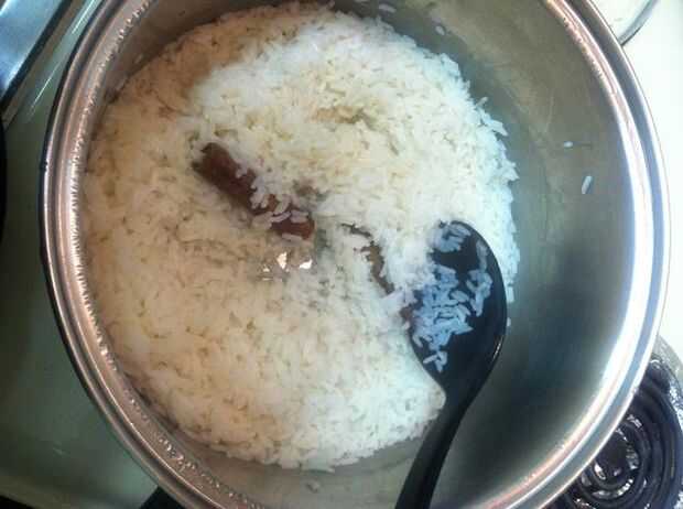 En una cacerola sobre fuego medio, tienes que colocar agua, arroz y una ramita de canela. Poner a hervir, tapa y cocer a fuego lento durante 15 minutos o hasta que el arroz esté tierno.