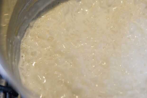 En una sartén combine la leche, arroz y sal. Poner a hervir luego dejar cocer a fuego lento durante unos 20-25 min o hasta que el arroz esté tierno (remover de vez en cuando).
