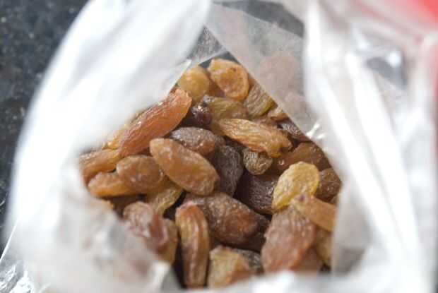 Retirar del fuego, coge 1/4 taza pasas de uva y los echan. Mezcle bien.