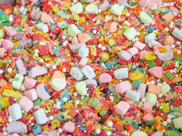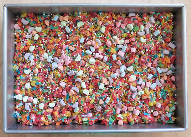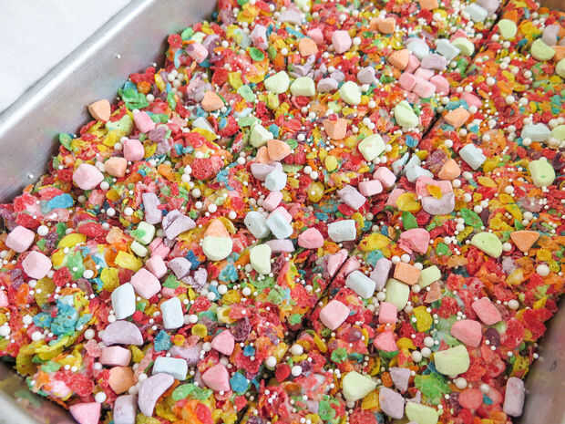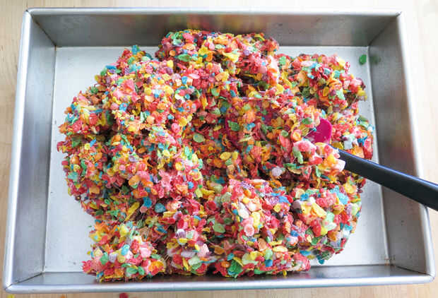 Difundir su pegajosa mezcla en una bandeja para hornear engrasada. Presiona con una cuchara/espátula o papel encerado. Una vez que se empuja hacia abajo, arriba las barras con bombones de cereal y lo rocía te quieren. Empuje suavemente estas abajo, así, con el papel encerado.