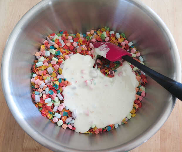 Revolver cuidadosamente hasta que el malvavisco derretido se incorporan a la mezcla de cereales.