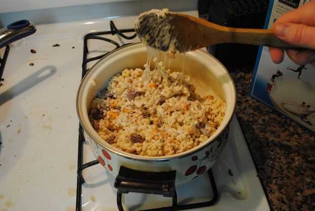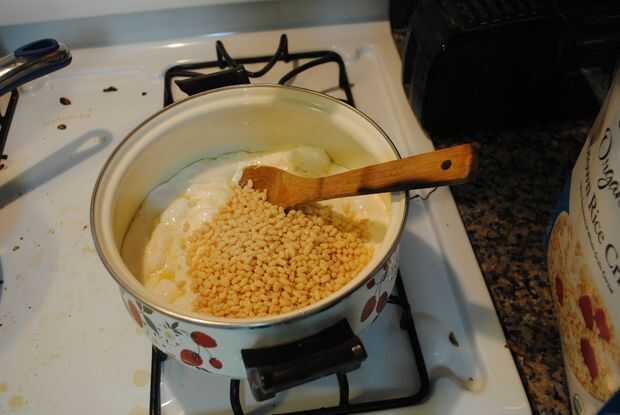Una vez que sus bombones son todos melty, es hora de agregar el cereal. Primero añadí el arroz crocante y entonces los conejitos frutales. Revuelva todo hasta incorpora todo.