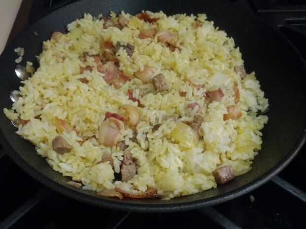 Finalmente arroz cocido con una almohadilla de manteca y una cuchara de curry en polvo mezclado en.