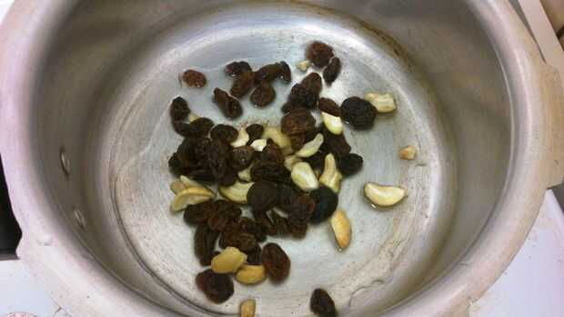 Colocar una olla en la estufa, agregue 2 cucharadas de mantequilla o aceite y calentarlo durante un minuto. Ahora agregar algunas pasas de uva y nueces de la India en el contenedor, como se muestra en la figura y la freímos hasta vueltas de color marrón rojizo.