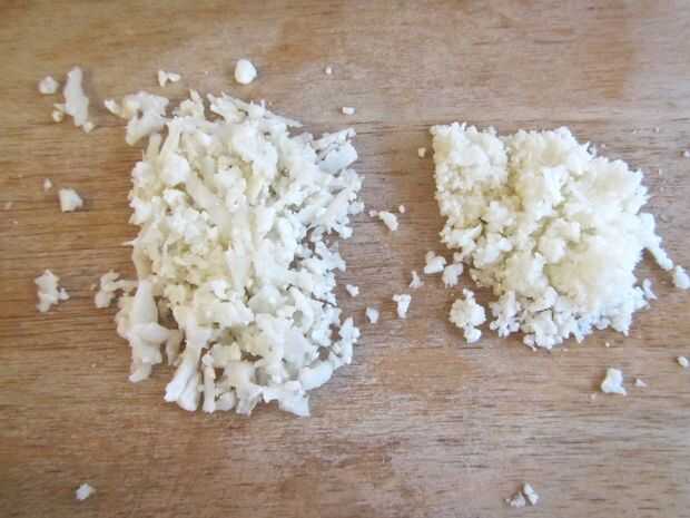 ¡ Listo! He coloco el arroz del método #1 (rallador de queso) en la mano izquierda de la foto y el arroz del método #2 (procesador de alimentos) en el lado derecho de la foto para dar una comparación lado a lado visual del producto final. Otra vez, como mencioné anteriormente en el Instructable, prefiero que la textura, forma y tamaño del arroz producción utilizando el rallador de queso, pero utilizando el método de procesador de alimentos es perceptiblemente más rápido y eficiente en comparación de tiempo.
