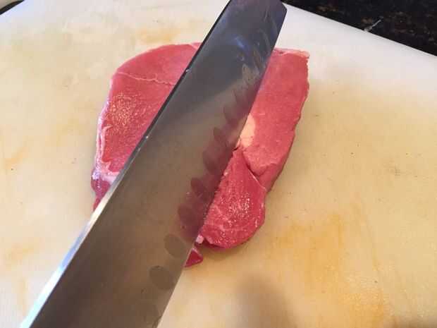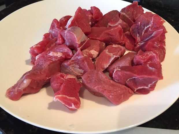 Mientras se cocinan las cebollas cortar el filete de la tirada de exceso de grasa y cortar la carne en trozos a su tamaño deseado (mina son sobre cubos de 1.5cmx1.5cm). Deje que la carne a temperatura ambiente antes de cocinar ya que evita que la carne va duro.