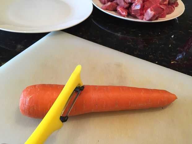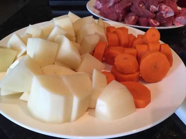 Paso 4: Pelar y trocear las verduras, la fruta y cortar la carne de vacuno