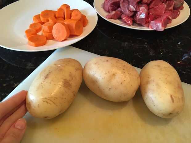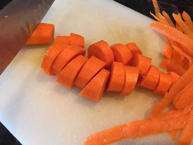 Pelar las papas y las zanahorias y picarlas en trozos pequeños o grandes trozos dependiendo de su preferencia, trozos grandes se demoran más en cocinar.