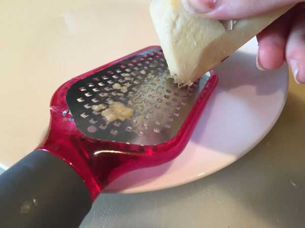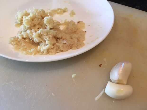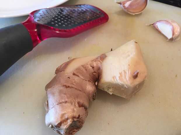 Luego, pelar el ajo y el jengibre y pique el ajo en una prensa de ajo (o picar muy finamente con un cuchillo) y rallar el jengibre (es realmente importante aquí usar jengibre fresco porque le da el curry sorprendente sabor!)