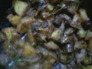freír patatas, pescado seco, cebolla y hojas de curry por separado. En una sartén añadir todos los ingredientes y cocinar hasta que el agua hierve.